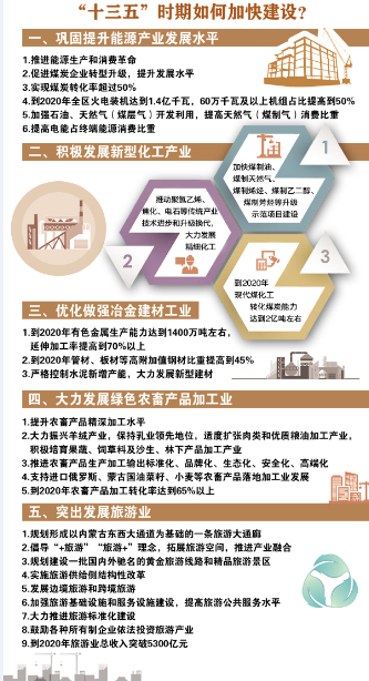“十三五”,依据资源环境承载能力,按照产业园区化、装置大型化、产品多元化、生产柔性化原则,我区将以鄂尔多斯、呼伦贝尔、赤峰等水煤组合条件较好地区为重点,加快煤制油、煤制天然气、煤制烯烃、煤制乙二醇、煤制芳烃等升级示范项目建设。
